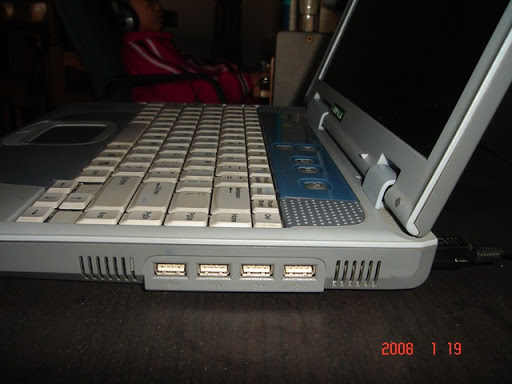 ข้างซ้ายนี่ บนสุดเอาไว้ต่อกับจอทีวีข้างนอก ถัดมาเป็นอินฟราเรด คิดดูว่ายุคนั้นจะมีอุปกรณ์ที่ใช้อินฟราเรดกี่ชนิดเอง แต่เครื่องนี้รองรับอุปกรณ์ไว้พร้อมก็เยี่ยม ตอนหลังใช้โอนรูปภาพจากมือถือของลูกสาวมาเก็บไว้ในคอมฯ ความเร็วไม่ต้องพูดถึงเพราะเราเน้นความเป็นไฮเทคอย่างเดียว ถัดมาก็ช่องไมโครโฟนกับลำโพงภายนอก แต่ไม่มีไลน์อิน คิดว่าคงไม่จำเป็นมั้งเพราะเราใช้เสียบจากช่องไมค์แทนก็ได้ แล้วก็มีช่องสายแลนกับโมเด็ม เต็มที่เลยสำหรับรุ่นนี้เมื่อเทียบกับโนตบุคระดับไฮ-เอน นอกจากนี้ยังมีลูกเล่นอีกเพียบ